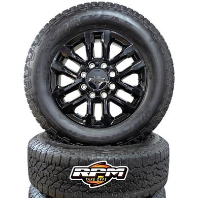 NEW TAKEOFF CHEVY 8 LUG 20" BLACKOUT PACKAGE WHEELS WITH LT275/60R20 GOODYEAR WRANGLER TRAILRUNNER AT TIRES